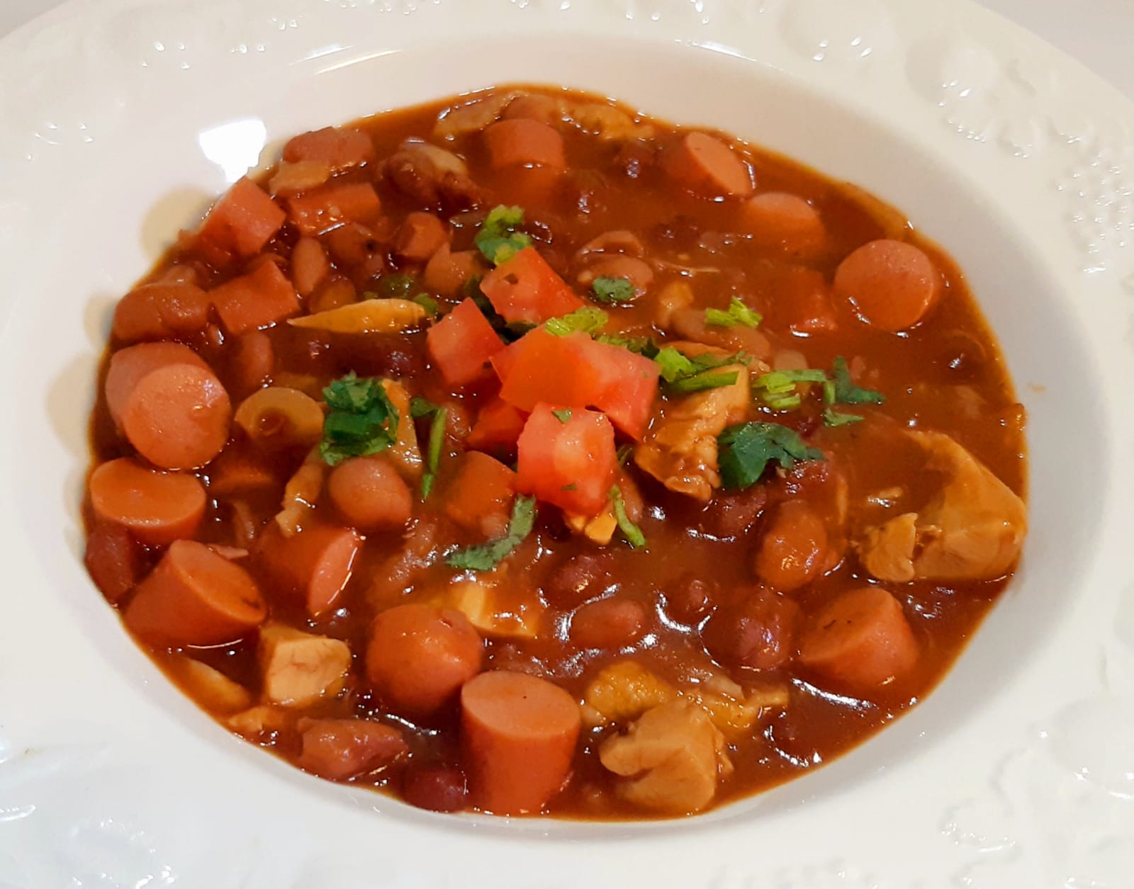 Vandaag hebben we de BB met R op het menu staan. BB met R hoor ik je denken, nou dat is Bruine Bonen met Rijst. Waar je bij de pindasoep een beetje rijst in de soep doet, schep je dit over je bord met rijst heen. Het vocht op de foto is de saus die de rijst heerlijk doet smaken. Dit gerecht wordt vaak op feestjes gegeten met allerlei bijgerechten. Maar kan ook heel goed als een volledige maaltijd gegeten worden, zeker als je het serveert met kousenband en rijst zoals wij vandaag doen. Naast de Bruine Bonen en Rijst zit er ook kipdijenvlees, zoutvlees (gezouten rundvlees) en kippenworst (halal) door.