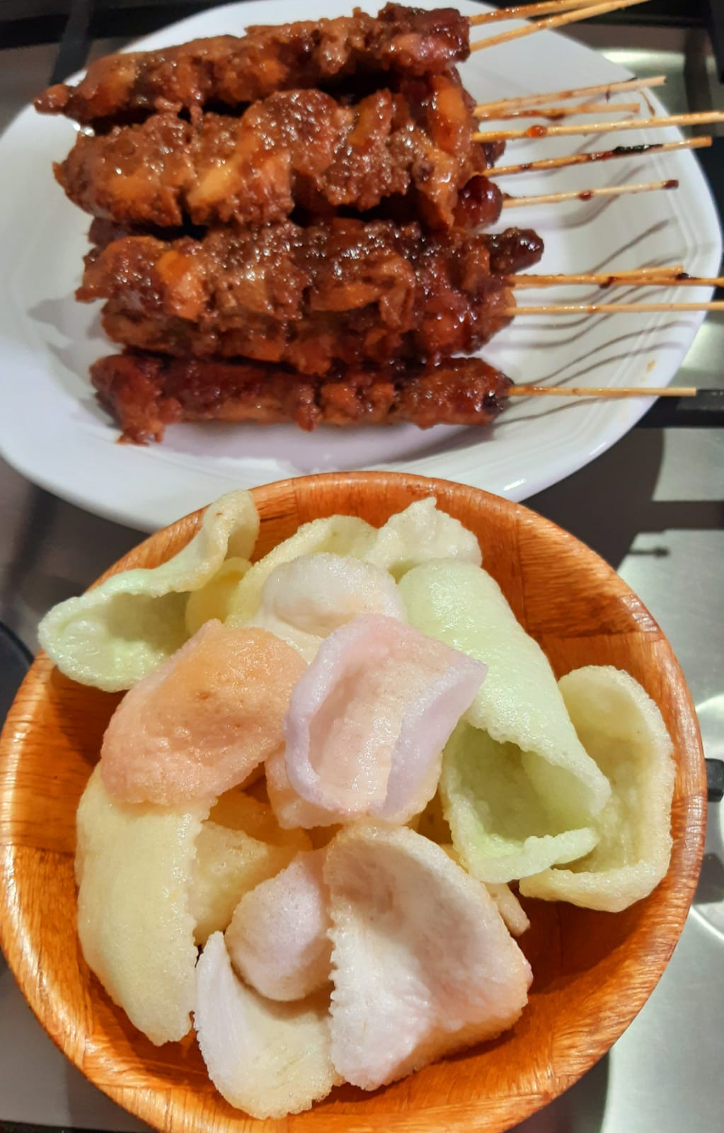 Het gerecht wordt geserveerd met 2 stokjes saté, kroepoek, groenten