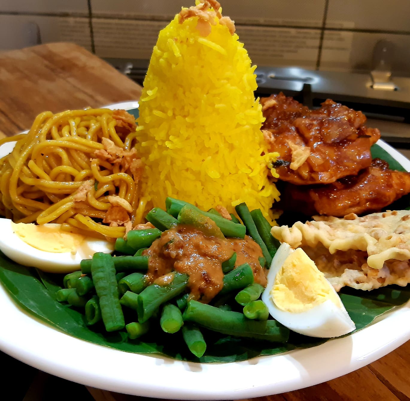 Nasi kuning wordt geserveerd met goreng telor en sajoer lodeh.