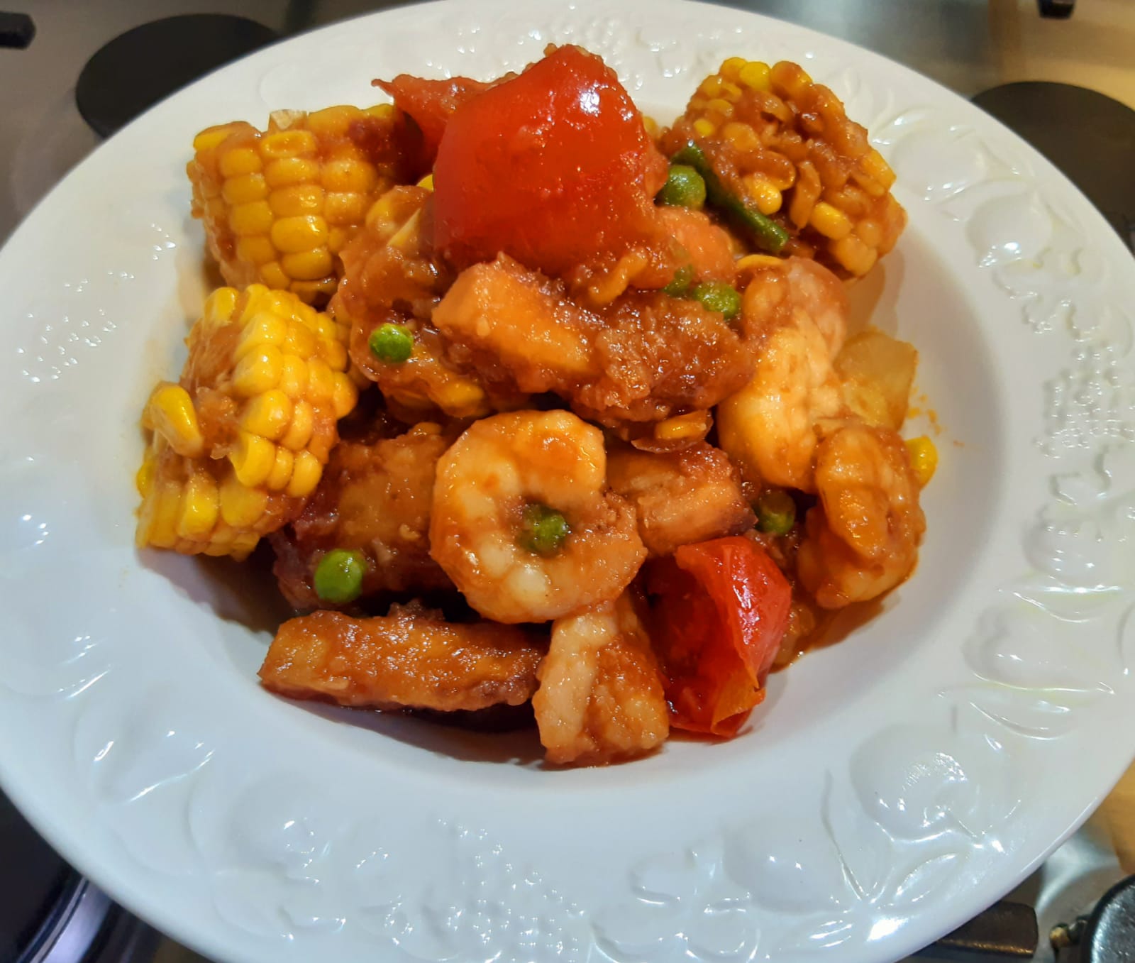 Wil je makkelijk eten, lekker op de bank uit een bak met een vork? Dan is dit gerecht zeer geschikt voor je, je kunt het natuurlijk ook gewoon aan tafel eten. Dit gerecht wordt klaargemaakt met: garnalen, zoete aardappel, aardappel, tomaat, erwten, mais, kousenband, stukjes zalm. Kortom een ware explosie in je kom of op je bord en ook in de mond. Met dit gerecht proef je de lente en tegelijkertijd de zomer.