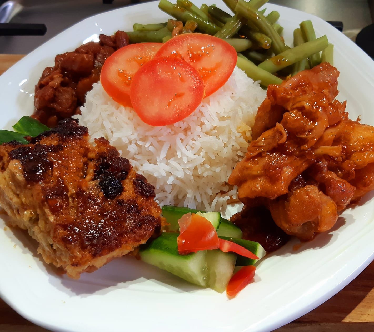 De laatste maaltijd deze week is nasi met stukjes cha sieuw (rode vlees) en 1 kippenbout.