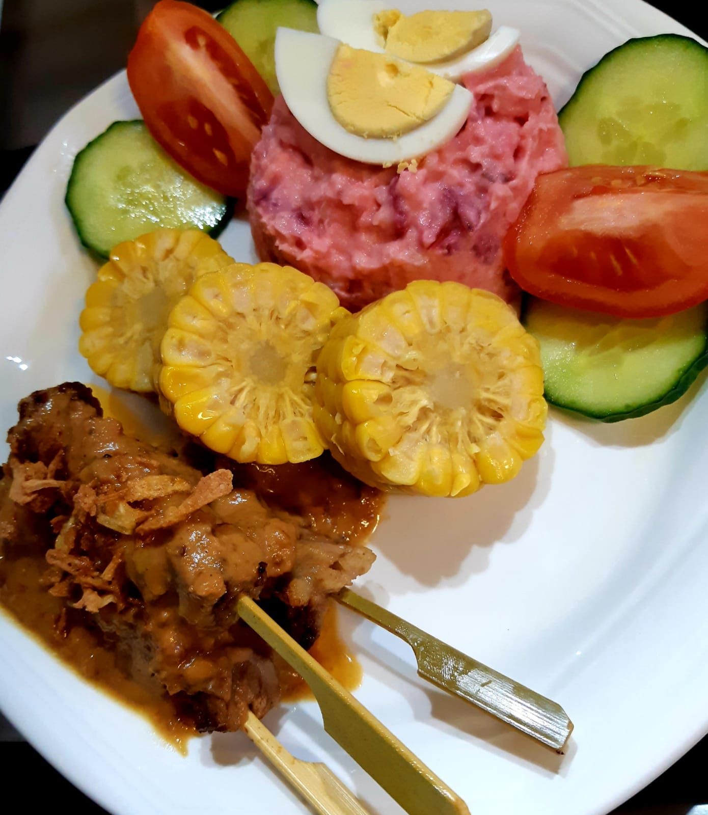 Als je die Salade combineert met Kipsate stokjes en wat lekkere mais heb je een feest op je bord bij ons krijg je dan de roze salade, 2 stokje kipsate, mais, tomaat, komkommer en wat ei om je bord mee te versieren zodat je thuis je eigen feestje kunt vieren.