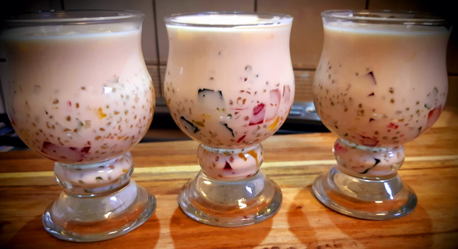 Sago drank is een zoete drank van onder andere kokosmelk, sagopearls en verschillende smaken jelly (Gelatine pudding)