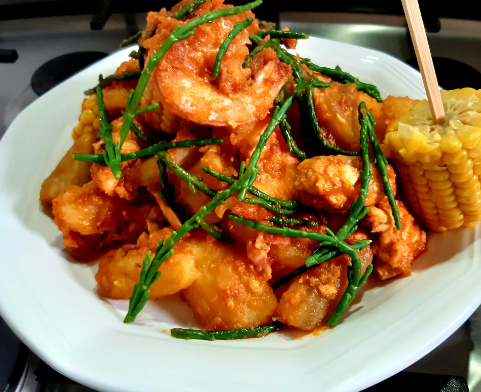 Vandaag hebben we een heerlijk zee gerecht: De Gamba Bowl. Deze Gamba bowl wordt gemaakt met verschillende soorten zoete aardappel, zalm, mais en zeekraal.