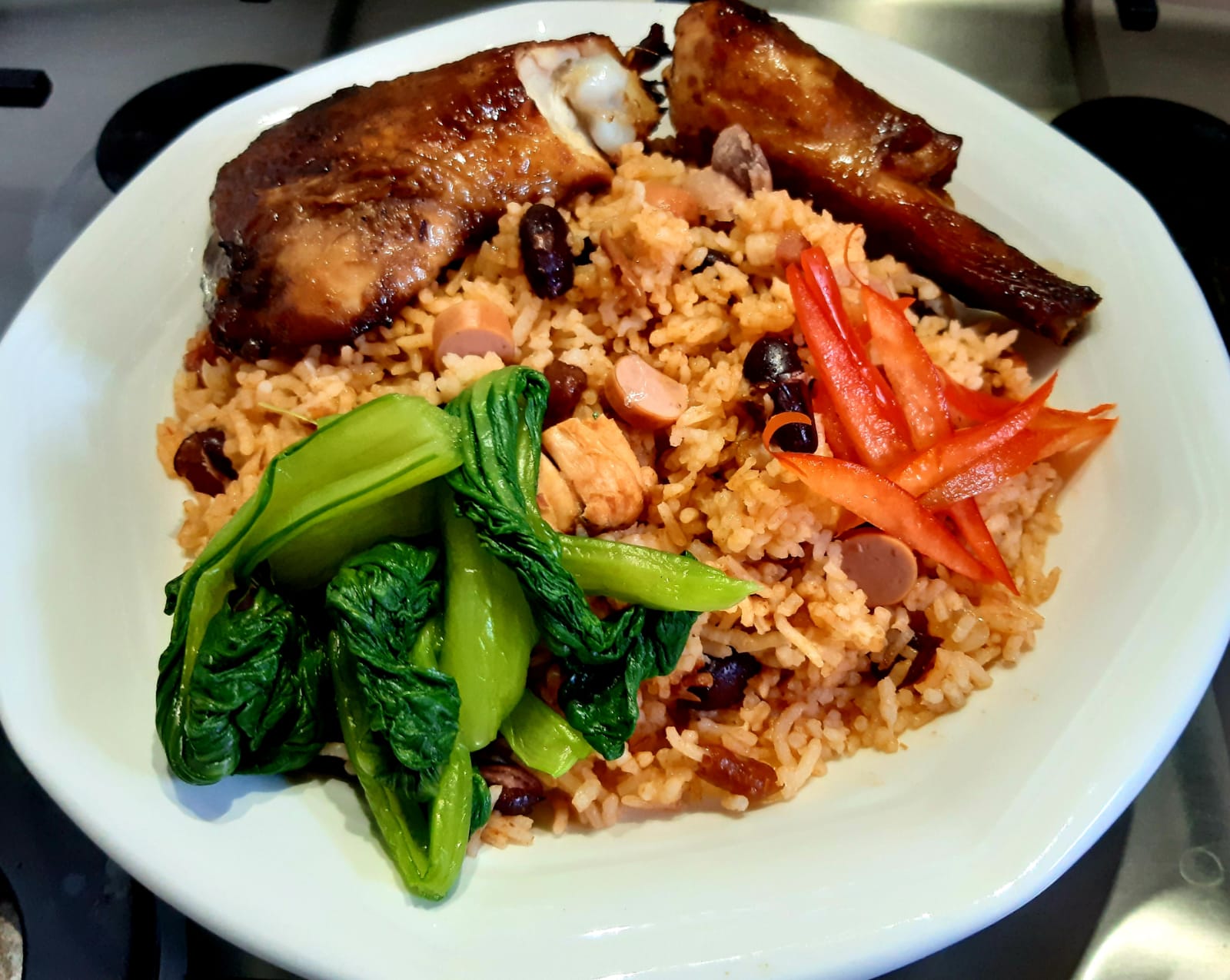 Vandaag hebben we een overheerlijke Chinese nasi. De Chinese nasi bestaat altijd uit een Nasi mengsel van Rijst en groenten, en vandaag hebben we hem met stukjes cha sieuw vlees (stukjes roodvlees) en serveren we hem met kipdijenvlees.