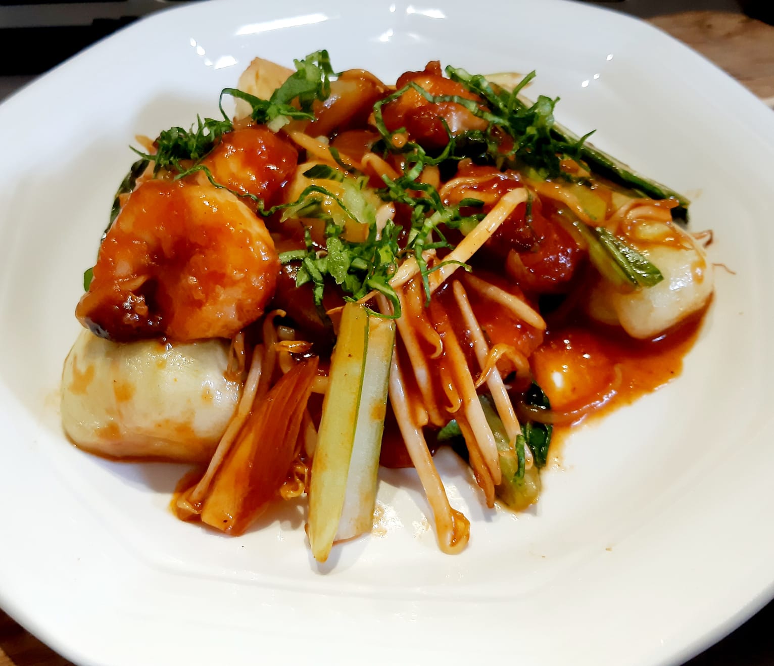 Het kan ook besteld worden met kipdijenfile ipv garnalen.