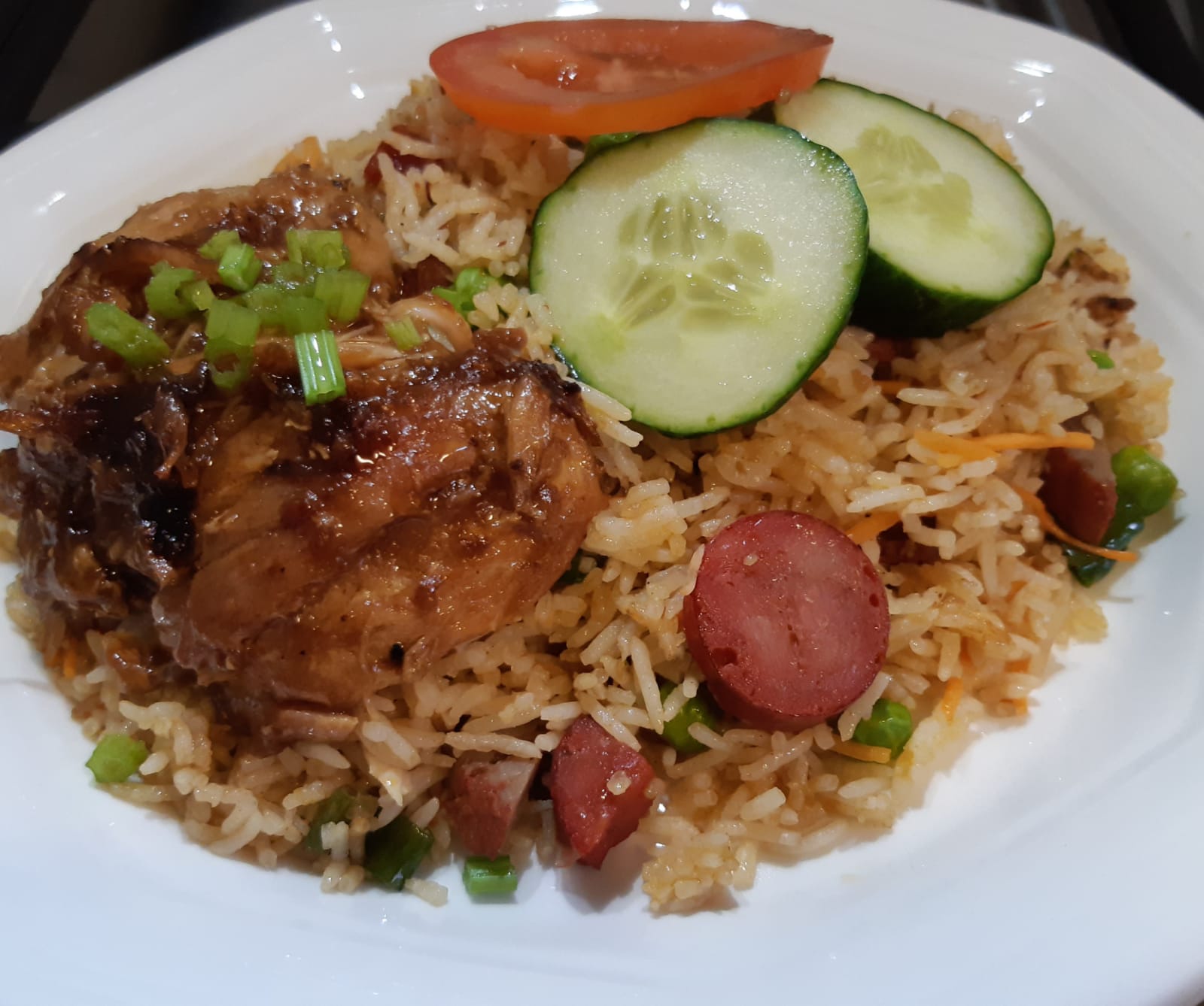 De laatste maaltijd deze week is nasi met stukjes cha sieuw (rode vlees) en 1 kippenbout.