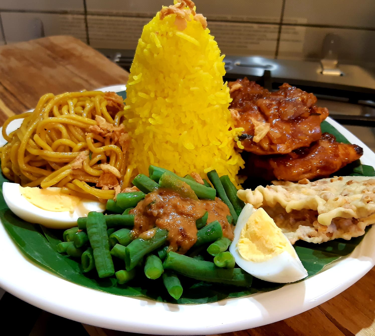Nasi kuning wordt geserveerd met gele rijst, kippenbout, pitjil, bami, rempeyek en ei.