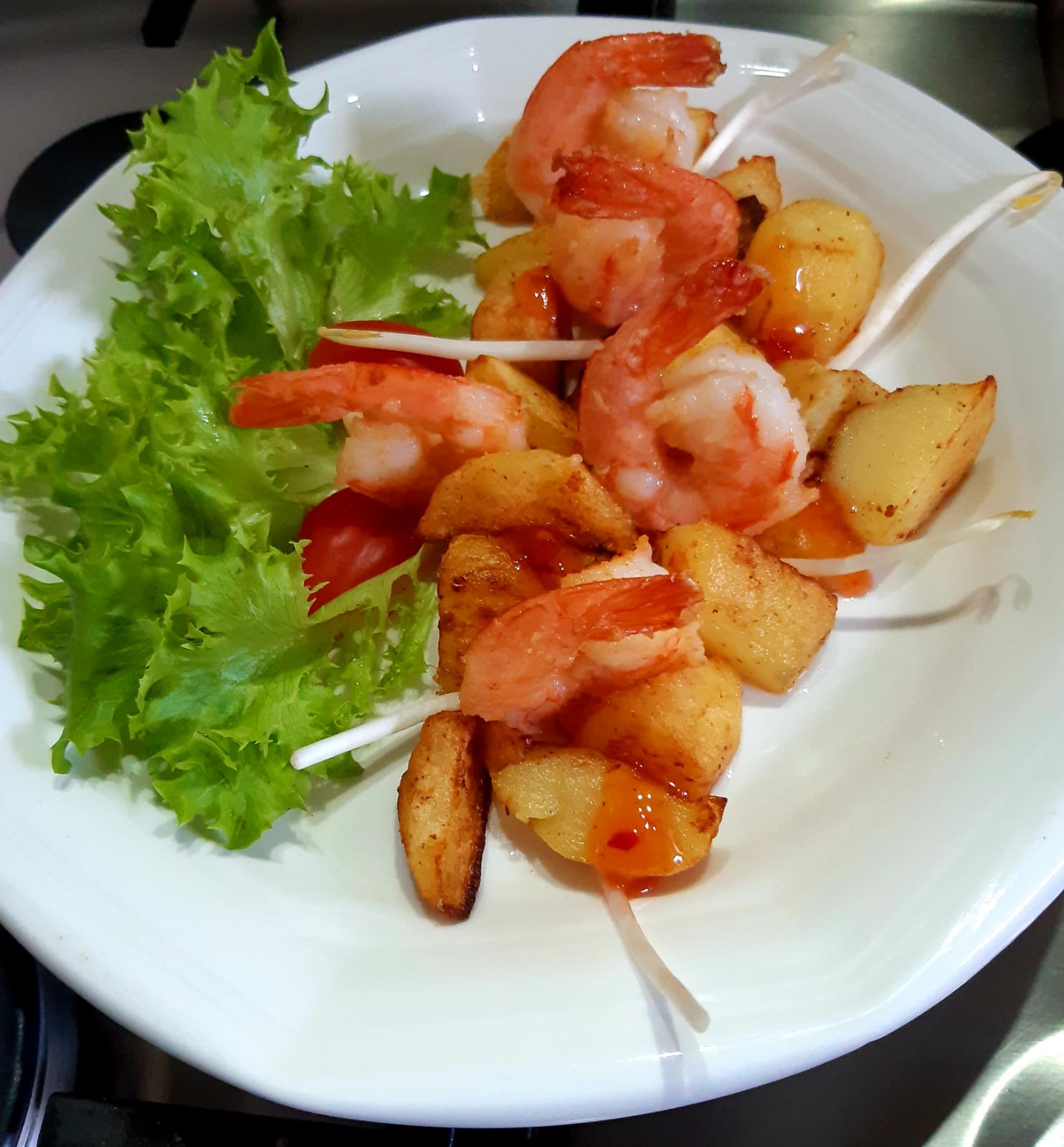 Op warme dagen zijn zee vruchten erg lekker en licht verteerbaar, vandaar dat we vandaag ook de Gamba Salade aanbieden. Wordt geserveerd met rauwkost, Gamba's, gebakken aardappeltjes en tomaat.