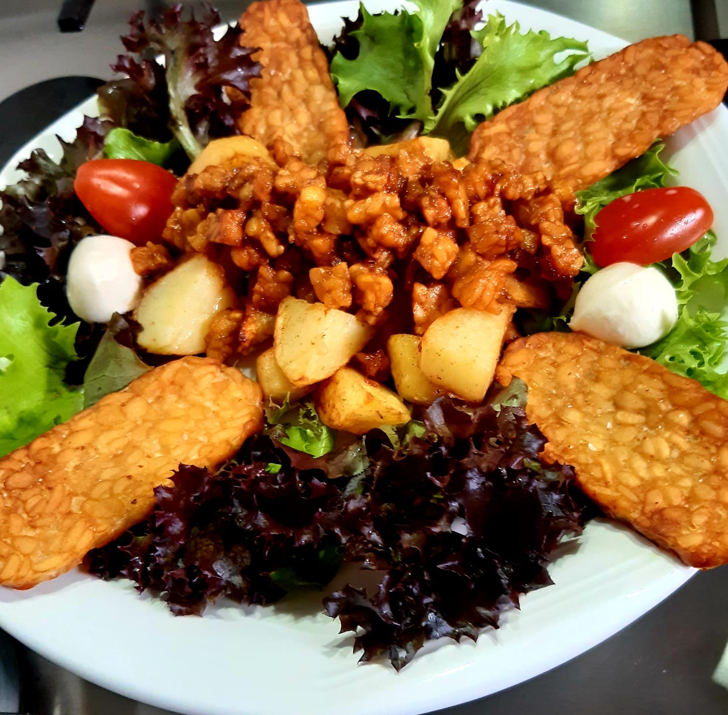In deze warme dagen is een lichte maaltijd natuurlijk veel lekkerder, en daarom hebben we vandaag de Veggie salad, oftewel de Maatlijd salade Veggie. De maaltijd salade wordt geserveerd met rauwkost, gebakken aardappeltjes, tempe, tomaat en teriyaki saus.