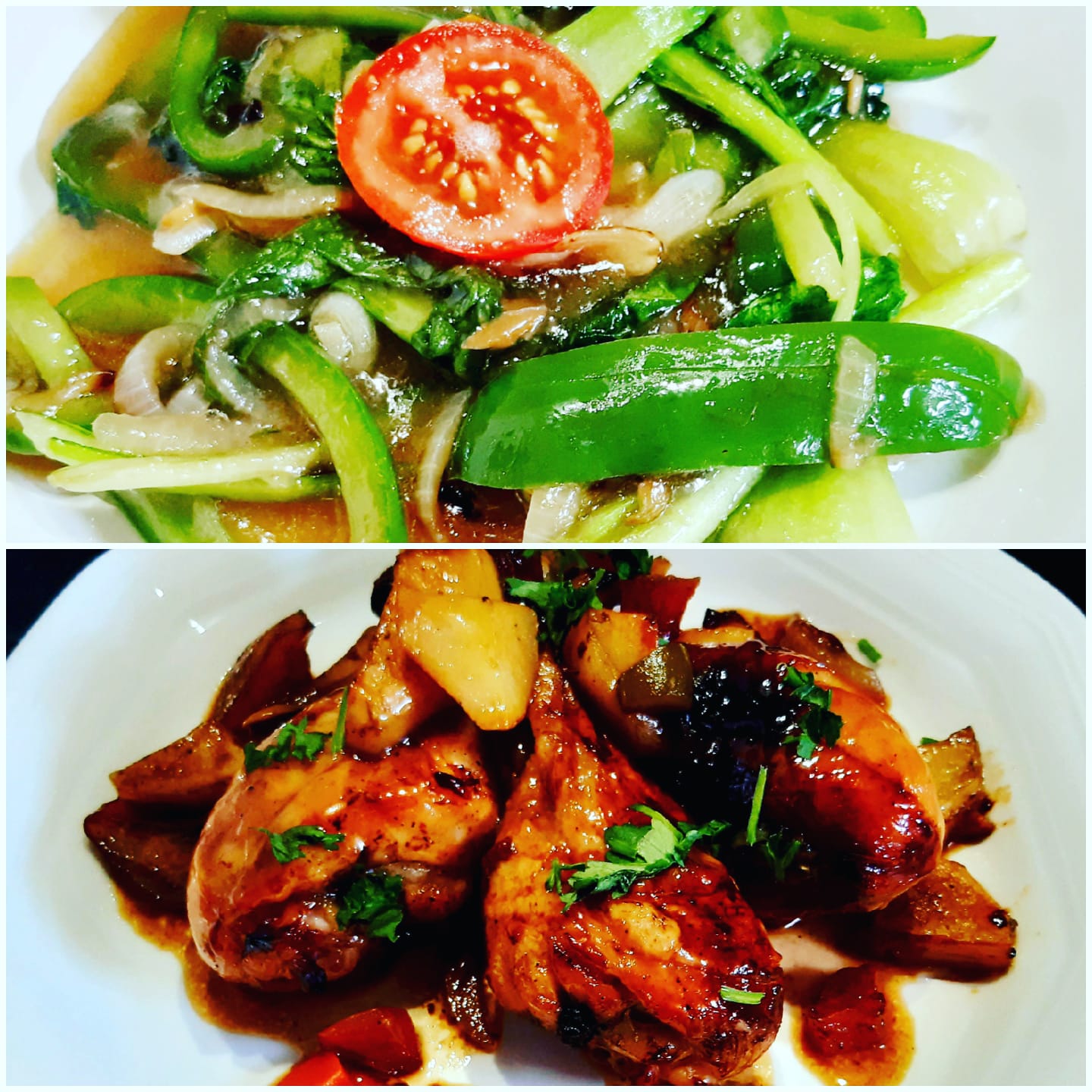 Zoetzuur gemarineerde drumsticks geserveerd met overheerlijke chinese groenten.