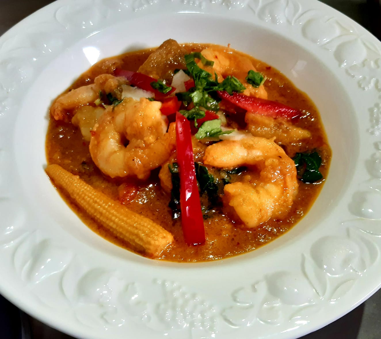 We krijgen wel eens de vraag of er in suriname alleen vlees en kip wordt gegeten, het antwoord hierop is natuurlijk nee. Neem dit gerecht nou.. Dit is een heerlijke curry met Garnalen en natuurlijk vol van smaak. De Curry bevat naast de garnalen, mais, jackfruit, paprika, aardappels, kikkererwten en wordt geserveerd met een bakje rijst.