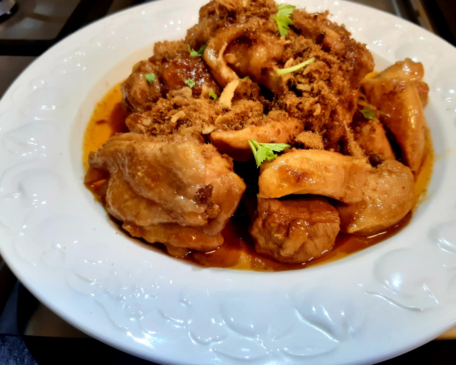 Vandaag hebben we een lekker Kip gerecht. Ketjap kip is gemaakt van Kipdijenvlees met abon sapi. Abon sapi (Meat woll) vindt zijn oorsprong in Indonesië en kan als een side dish gegeten worden. Bij ons is het onderdeel van de maaltijd gecombineerd met overheerlijke kousenband, rijst en aardappel sambal.
